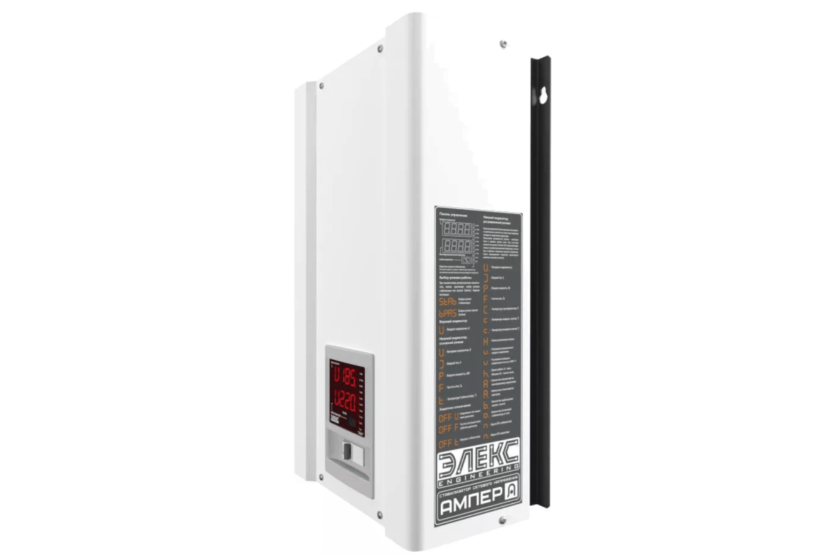 К особенностям данного стабилизатора можно отнести двойной светодиодный экран, линейную полосу загрузки, наличие электронного транзита (байпас), удобное расположение клеммной колодки для подключения на задней части корпуса, бесшумную работу за счет использования в качестве силовых ключей симисторов.