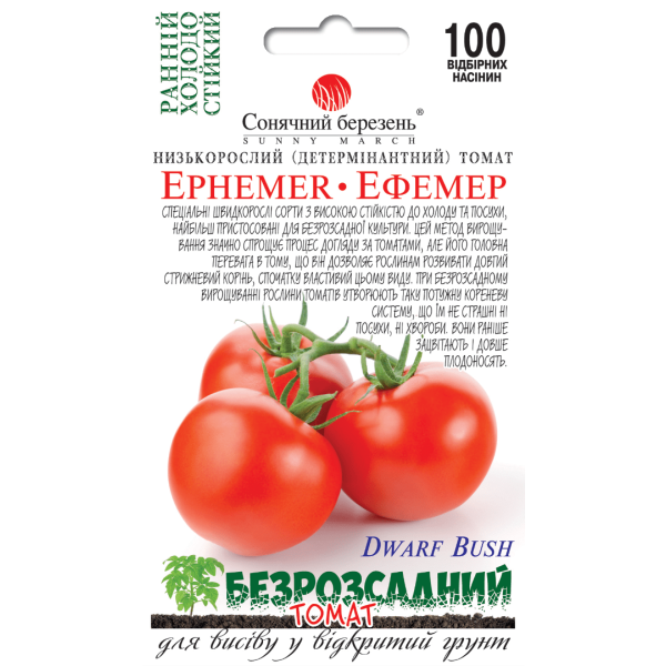 Проверенный временем скороспелый сорт, привлекающий своей неприхотливостью в уходе, способностью переносить резкие понижения температуры и даже засуху. Благодаря мощному росту растений и быстрой дружной отдаче раннего урожая Эфемер «уходит» от фитофтороза и не успевает заболеть. Растение детерминантное, высотой 0,5-0,7 метра. Его можно не пасынковать, но если удалять пасынки, урожай будет раньше, а плоды крупнее и качественнее. На одном растении может созреть 5-7 кистей с 3-5 томатами среднего размера, весом 70-100 г. Помидоры ярко-красного цвета, округлые, с гладкой блестящей кожицей. Мякоть мясистая и сочная, приятного сладкого вкуса. Этот сорт ценится, и считается одним из лучших для засолки и цельноплодного консервирования. Хорошо хранится, от 1 до 2-х месяцев после сбора, который начинают через 80-90 дней после всходов.