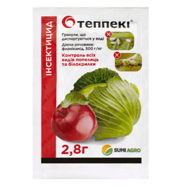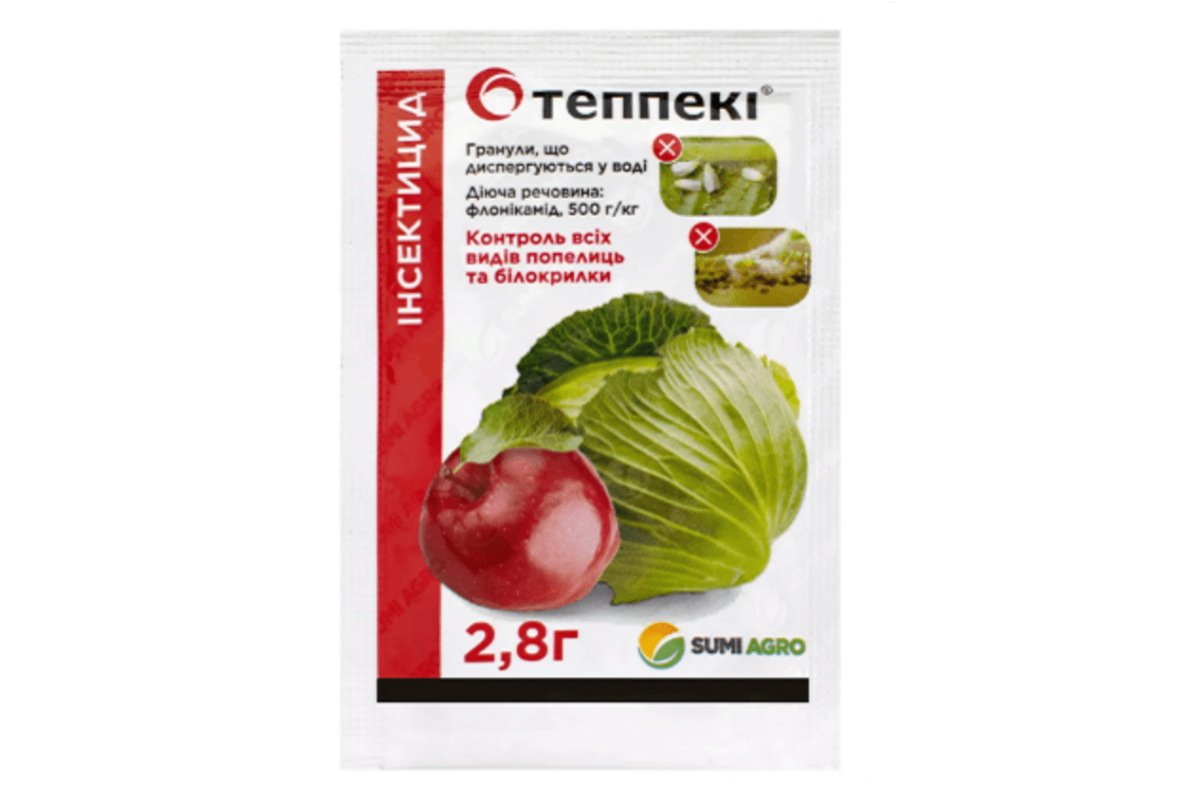 Теппеки в.г. 2,8 г (Sumi Agro) – это системно-трансламинарный инсектицид с контактно-кишечной активностью, специально разработанный для защиты яблони от тли, а также капусты от тли и белокрылки. Обеспечивает контроль всех видов тлей, в том числе устойчивых к неоникотиноидам, пиретроидам, карбаматам и фосфорорганическим инсектицидам.