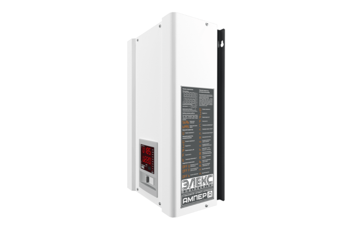 Однофазний стабілізатор напруги Ампер-Р У 16-1/40 v2.1 (розширений) призначений для роботи в електричних мережах з коливаннями напруги від 120 до 275В. У цьому діапазоні апарат гарантовано видає на виході напругу в рамках 220 ± 3,5%, що забезпечується за рахунок використання 16 ступенів стабілізації. Номінальна потужність даної моделі 9 кВт, що відповідає робочому струму автоматичного вимикача 40А на ньому.